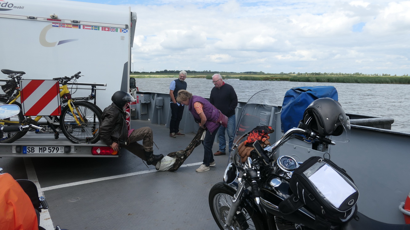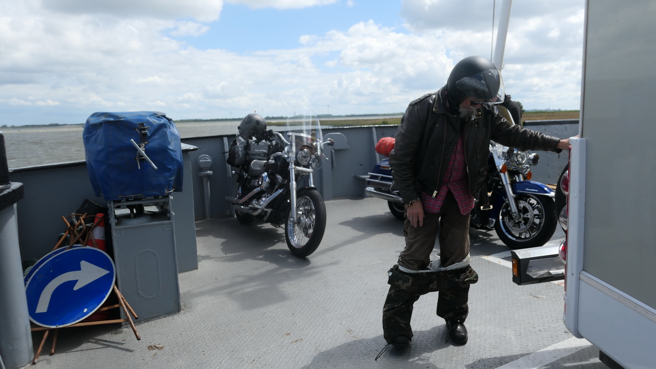 Enfin après Brêmes le ciel bleu apparait et on arrive au Bac à Wischhafen pour traverser l'Elbe en ferry au sec. Donc sur le bac , on se déséquipe