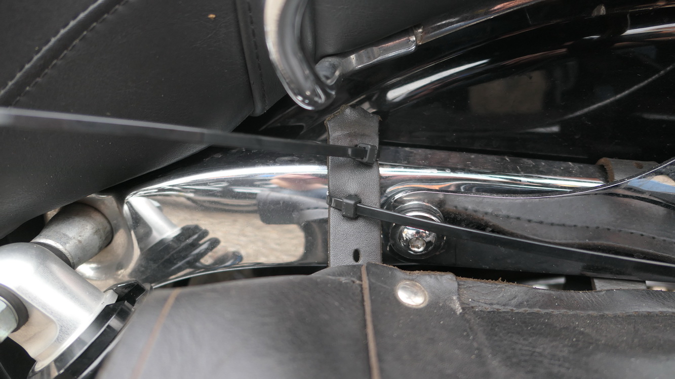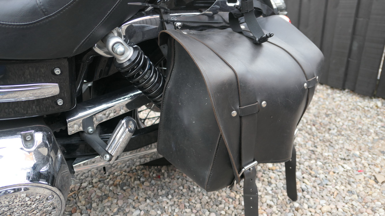 On prépare les motos et après une vérification, la sacoche en cuir de la Dyna semble bien basse : en effet une sangle en cuir a lâché!