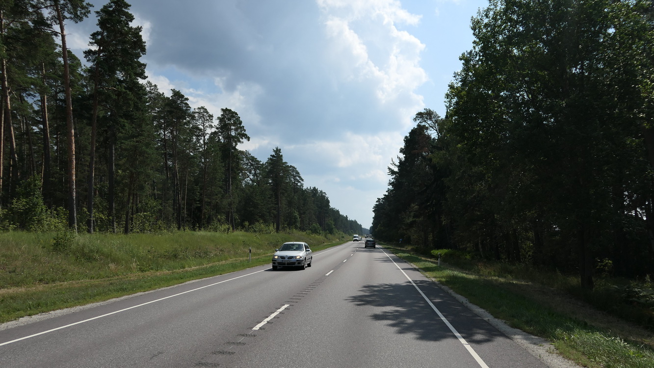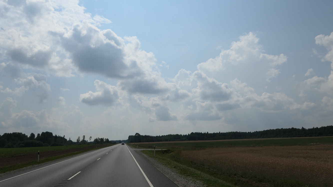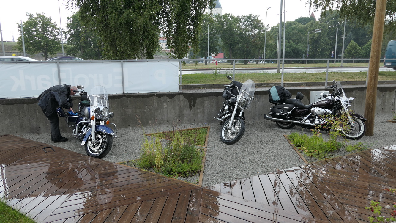 Mauvaise nouvelle, il commence à pleuvoir, on partira sous la pluie et on mettra 1h pour sortir de Tallinn , le soleil revient très vite et on enlève nos vêtements de protection.
