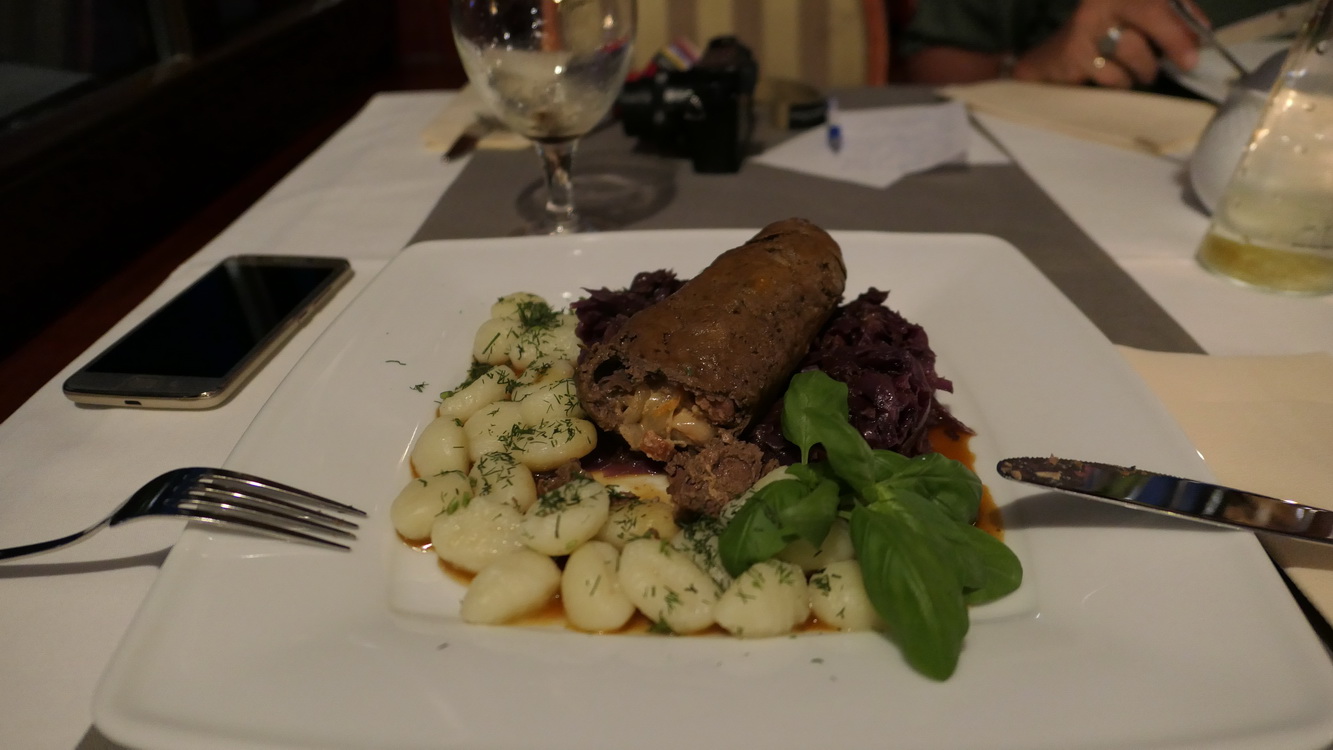 Le repas traditionnel polonais, de la viande de boeuf roulé avec à l'intérieur des oignons de la saucisse, accopagné de choux rouge chaud : c'est spécial, nous avons pris également du vin polonais : il est assez fort mais se boit bien!