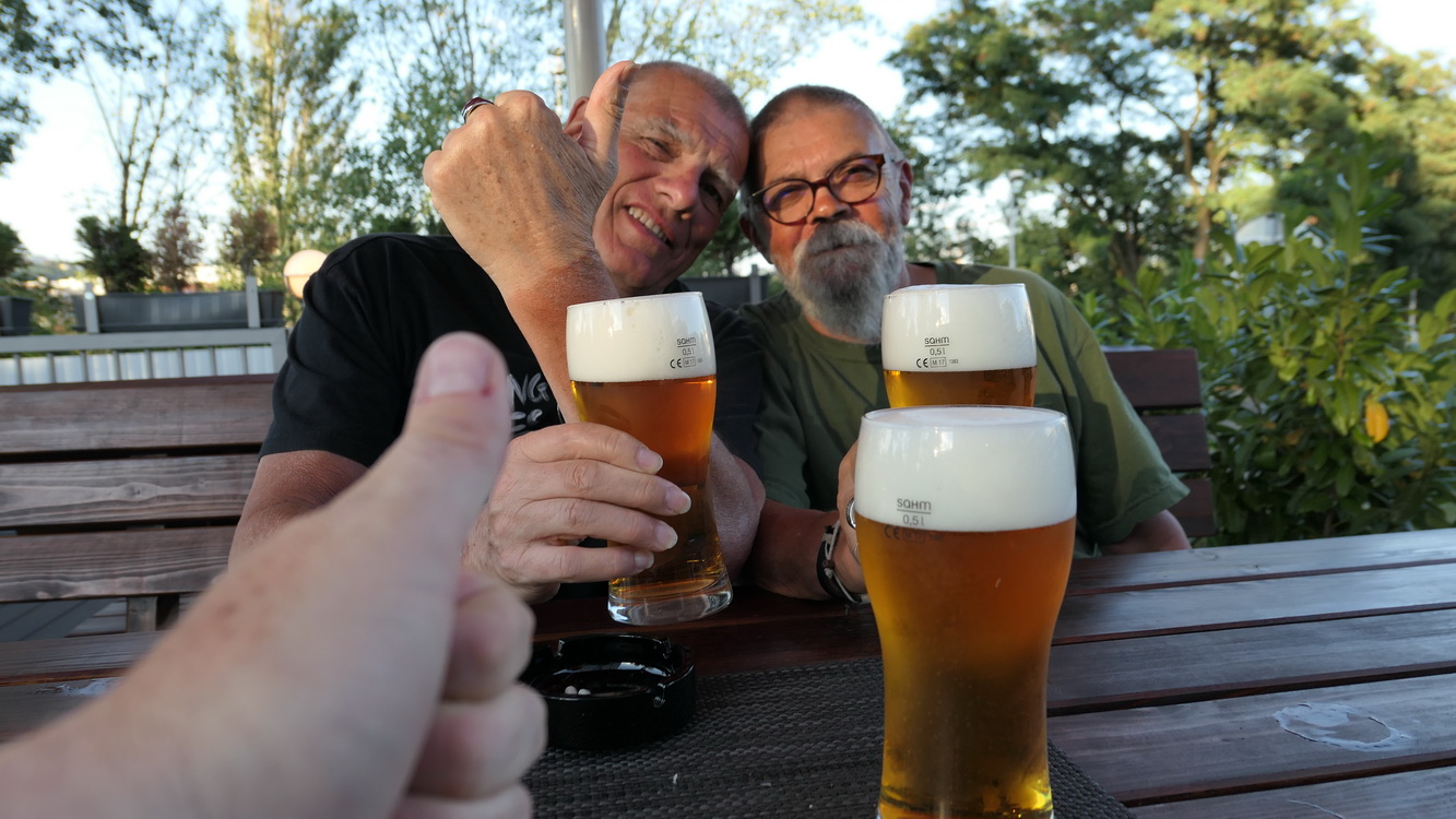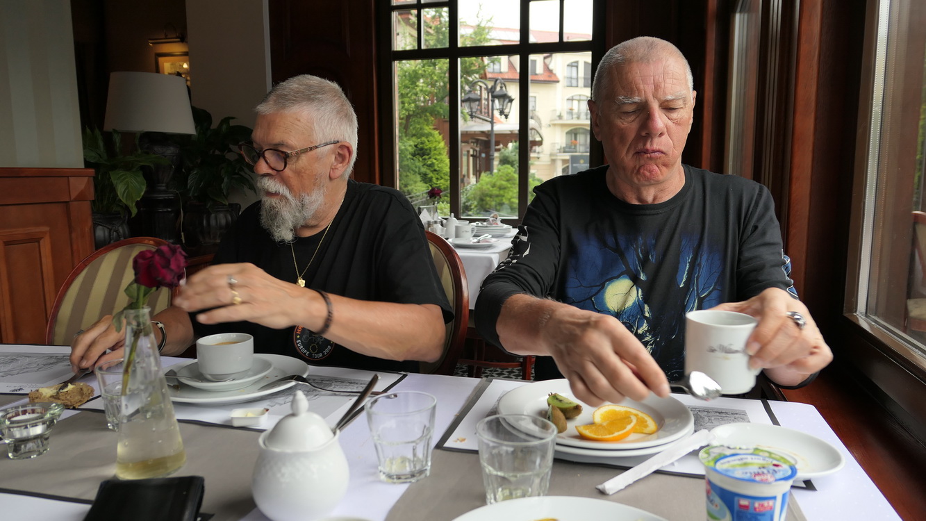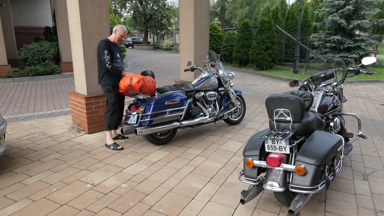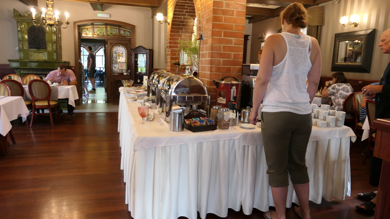 Le petit déjeuner au départ d'Auschwitz en compagnie de Suzanna notre copine motarde de Finlande