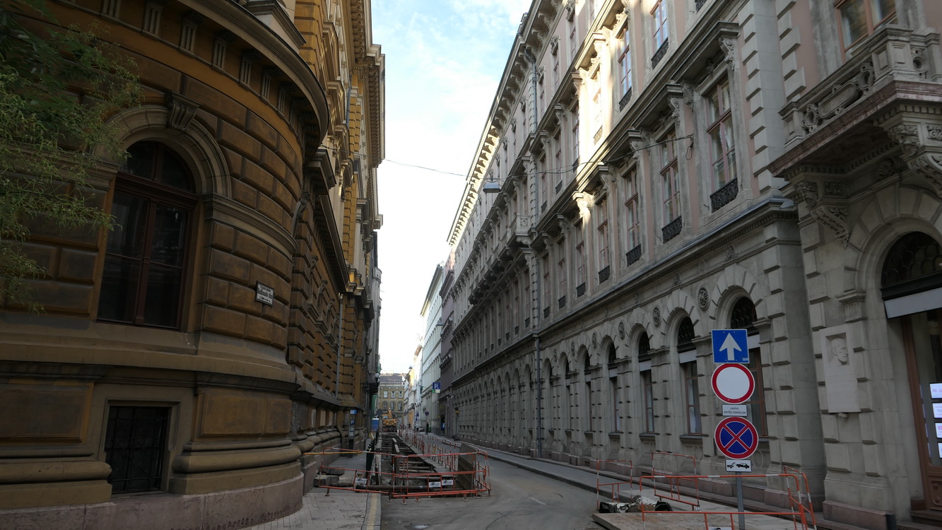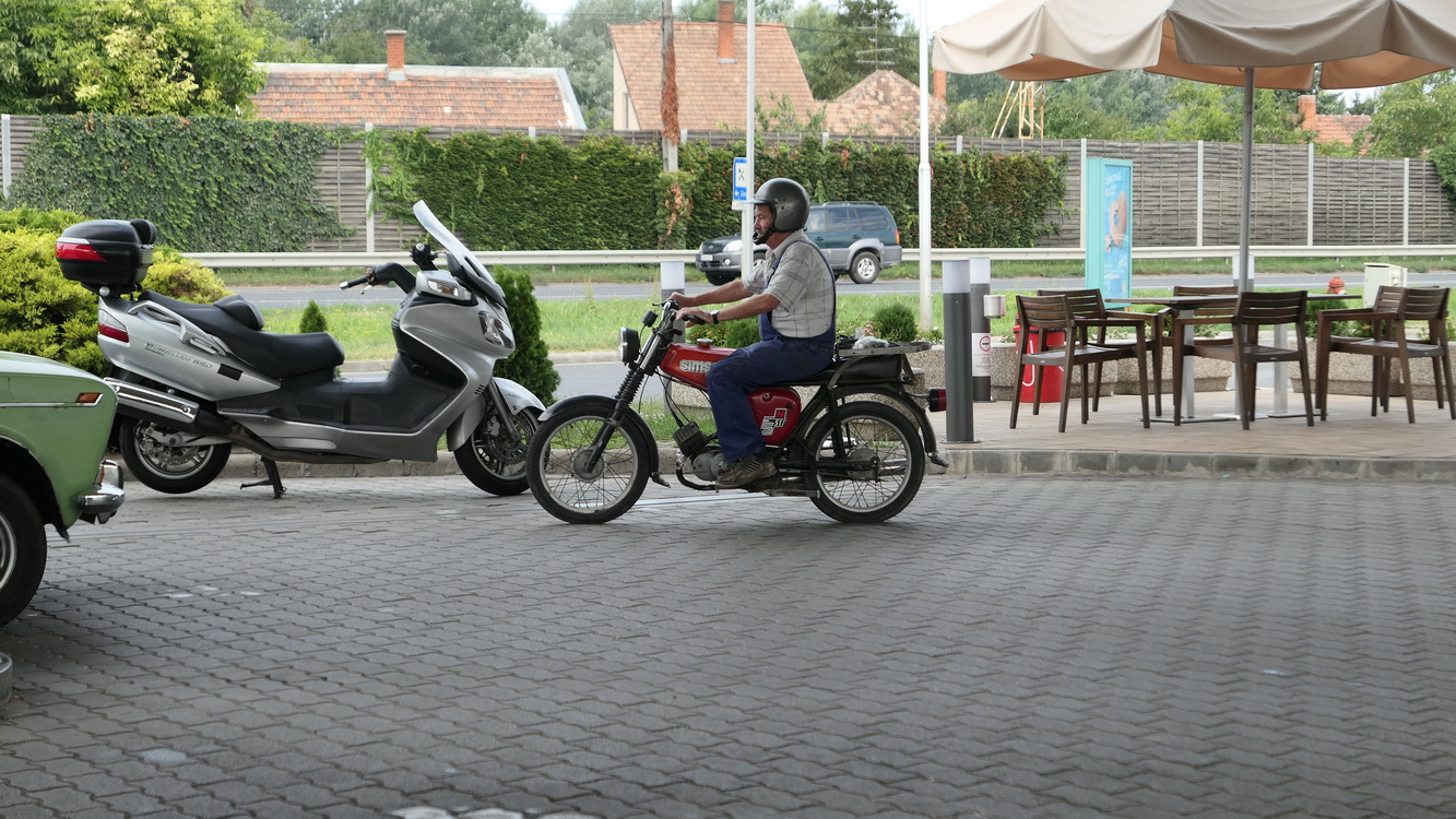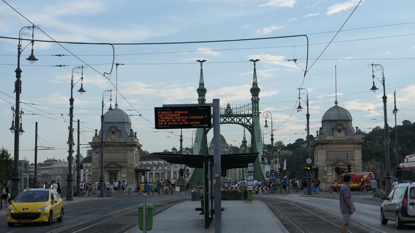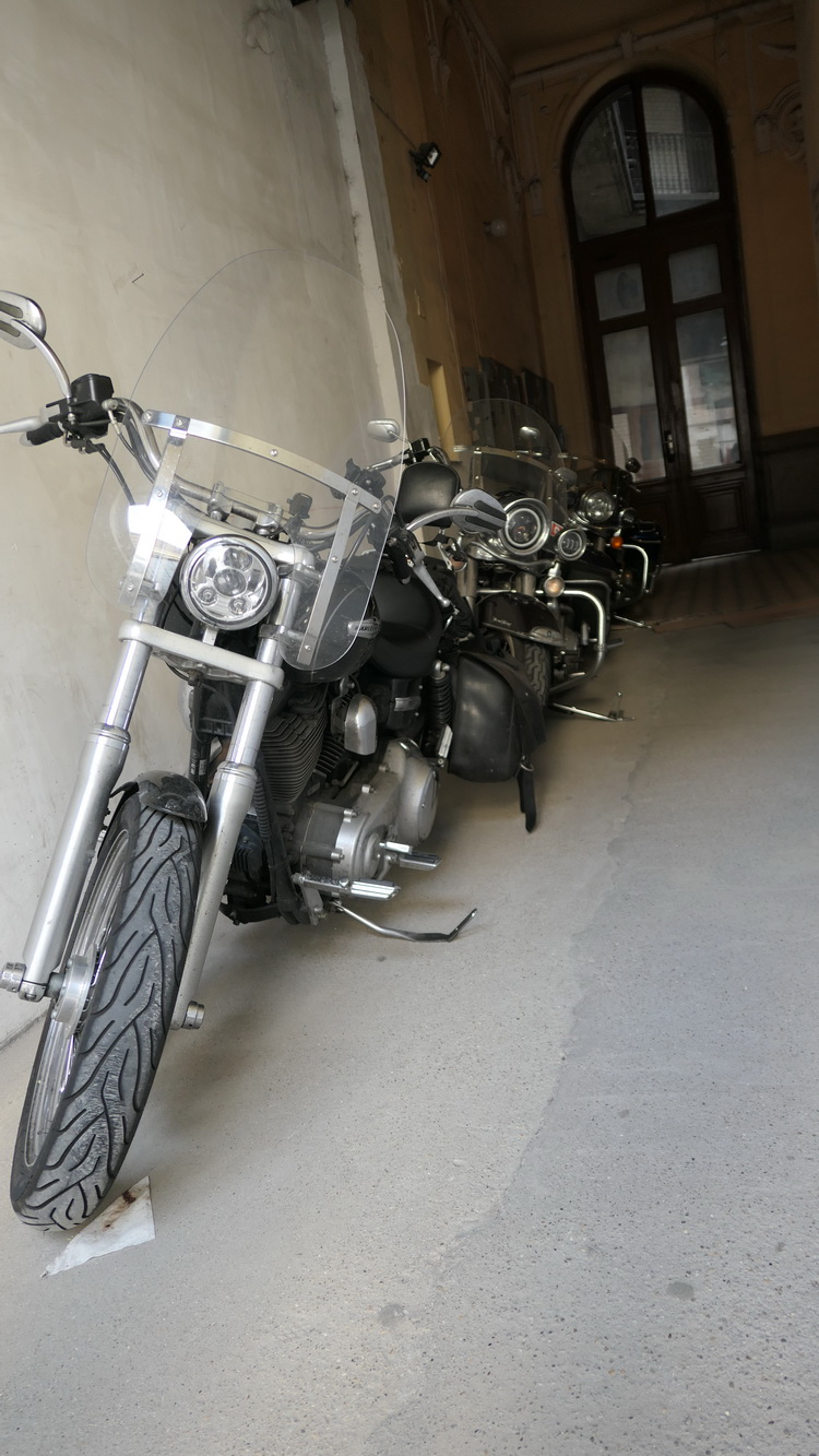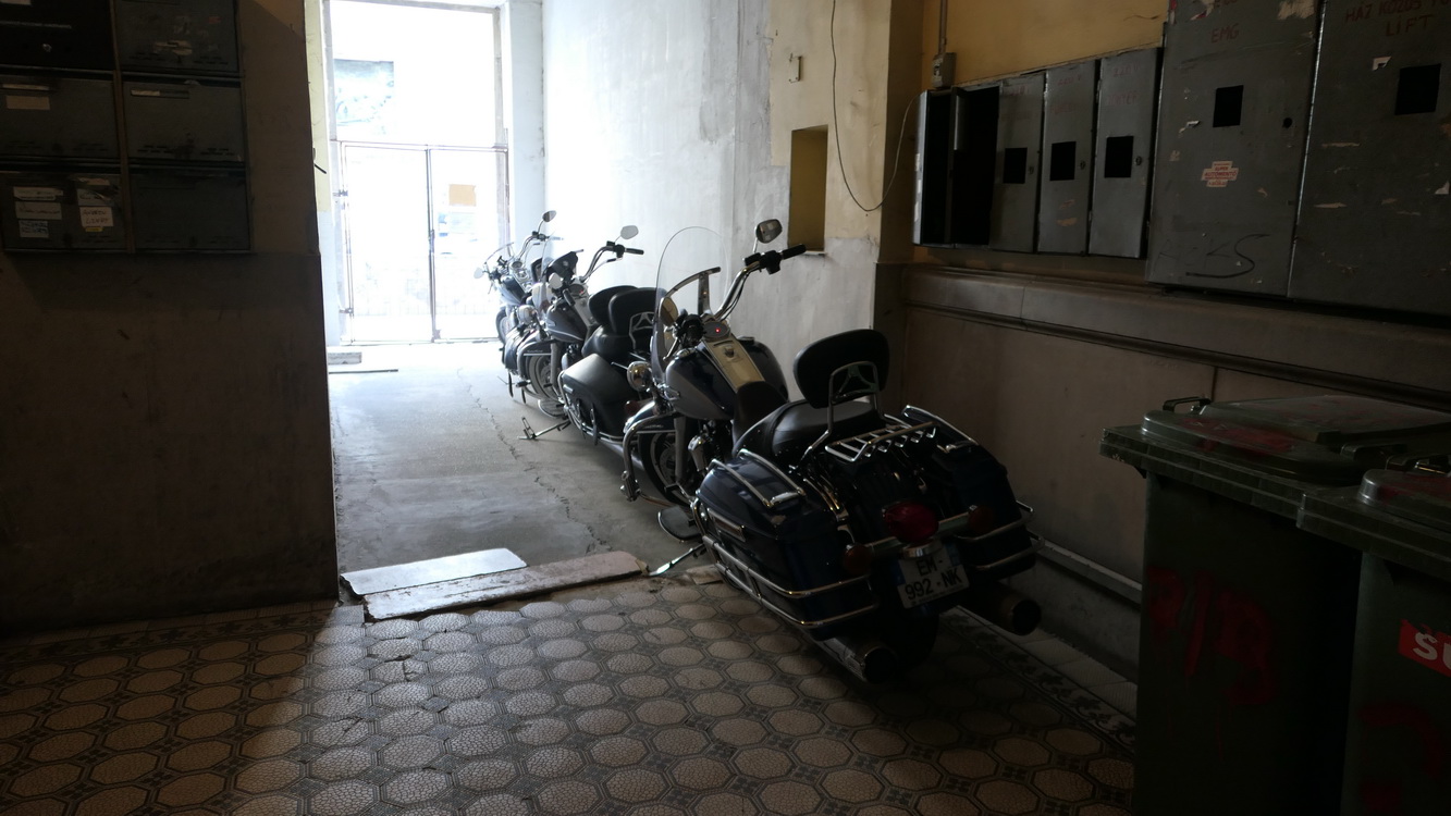 Nous arrivons à Budapest vers 15h30 et nous avons droit à une petite averse qui nous oblige à nous réfugier dans une station service, nous repartons 30 minutes après à la recherche de notre appartement en plein centre: un peu galère pour trouver et voir une personne pour avoir les clés. De plus pas de parking pour les motos, on décide de dévisser la porte pour rentrer les motos dans le hall d'entrée de l'immeuble des années 50 soviétiques!