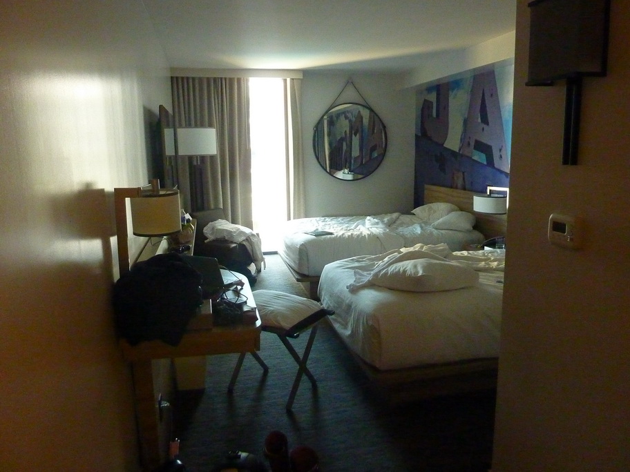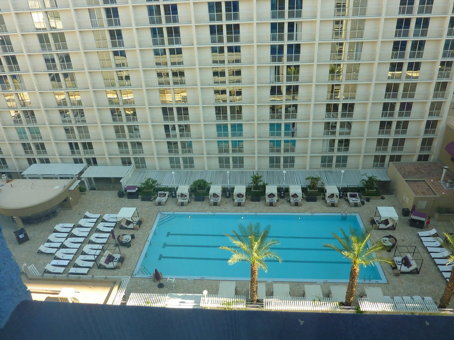 Une photo de la chambre à 400$ avec les waterbed et de la piscine vue de notre chambre.