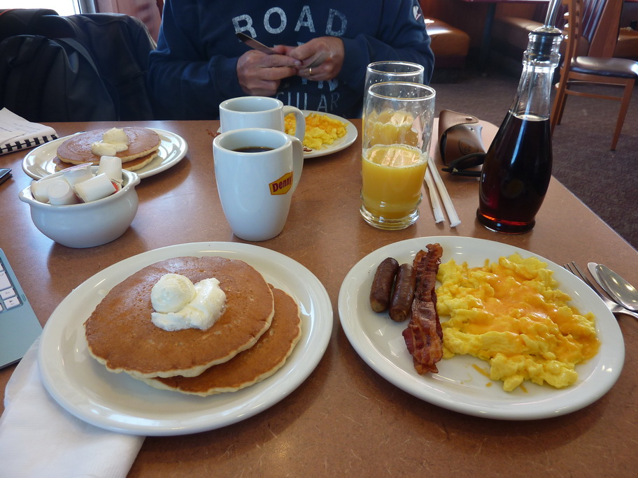 Autoroute , puis on arrive à parhump à 8h30, on décide de faire le plein et de déjeuner pour prendre des forces avant la grande traversée du désert : Denny's.