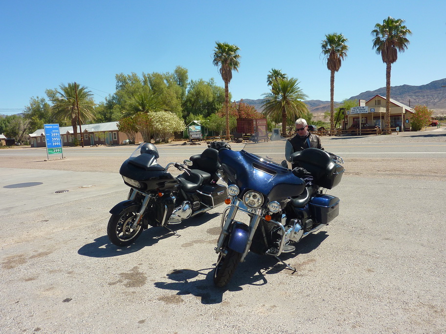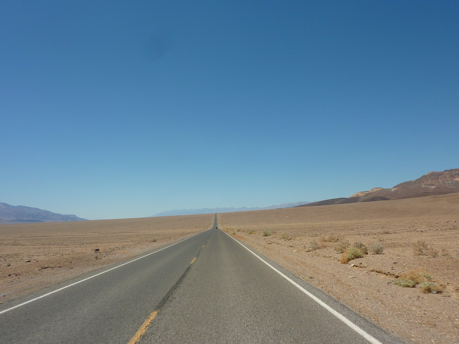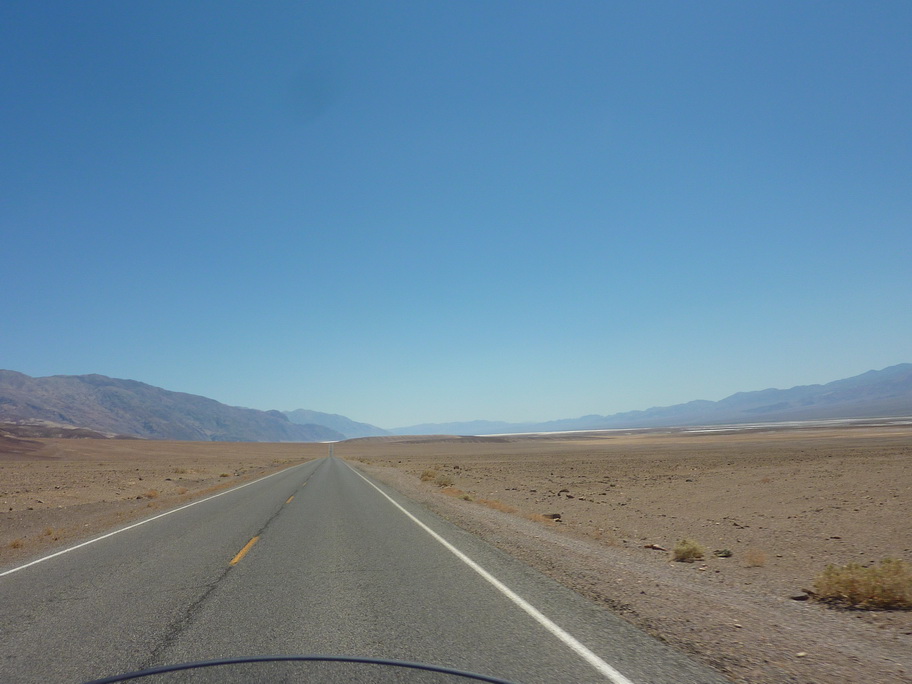 On repart , ça chauffe sous les casques. On arrive à l'entrée de Death Valley: photo devant le panneau.
