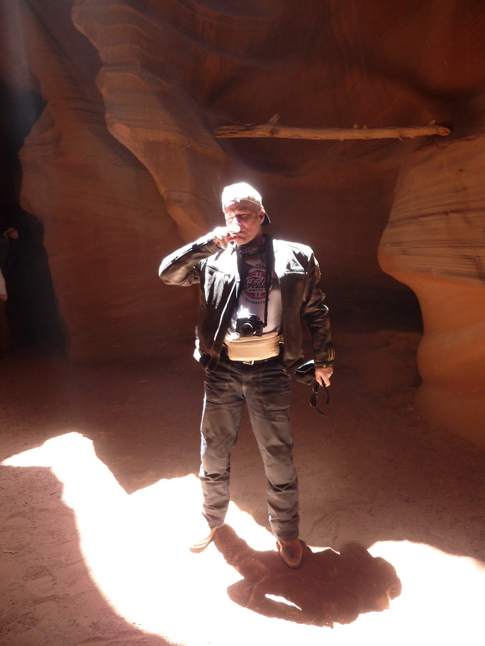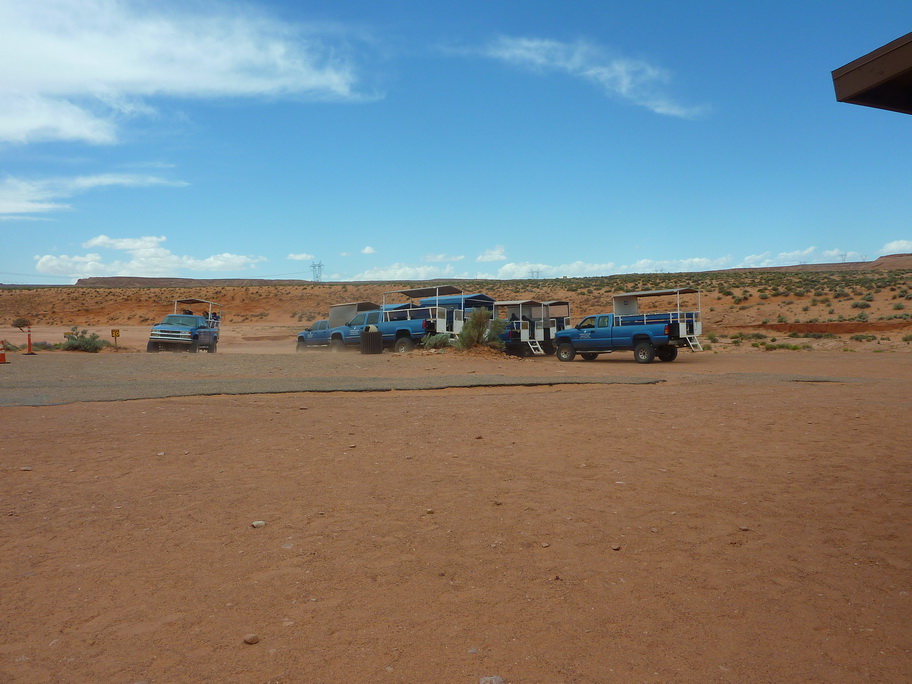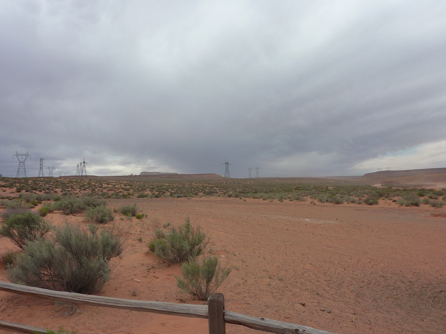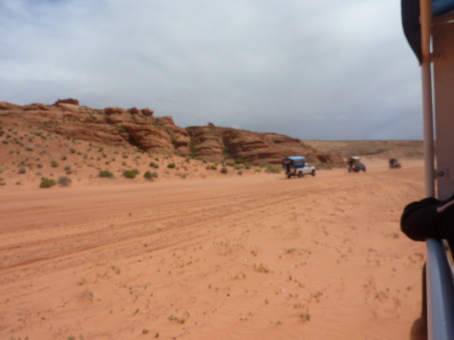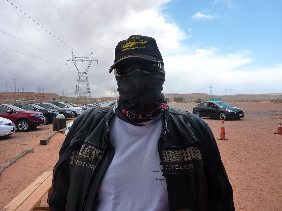Arrivés à la réserve pour visiter Antelope canyon, le vent se lève et on voit au loin des mauvais nuages, une tempête de sable approche. Ca y est elle est là, nous mettons nos casquettes et nos foulards sur le nez.