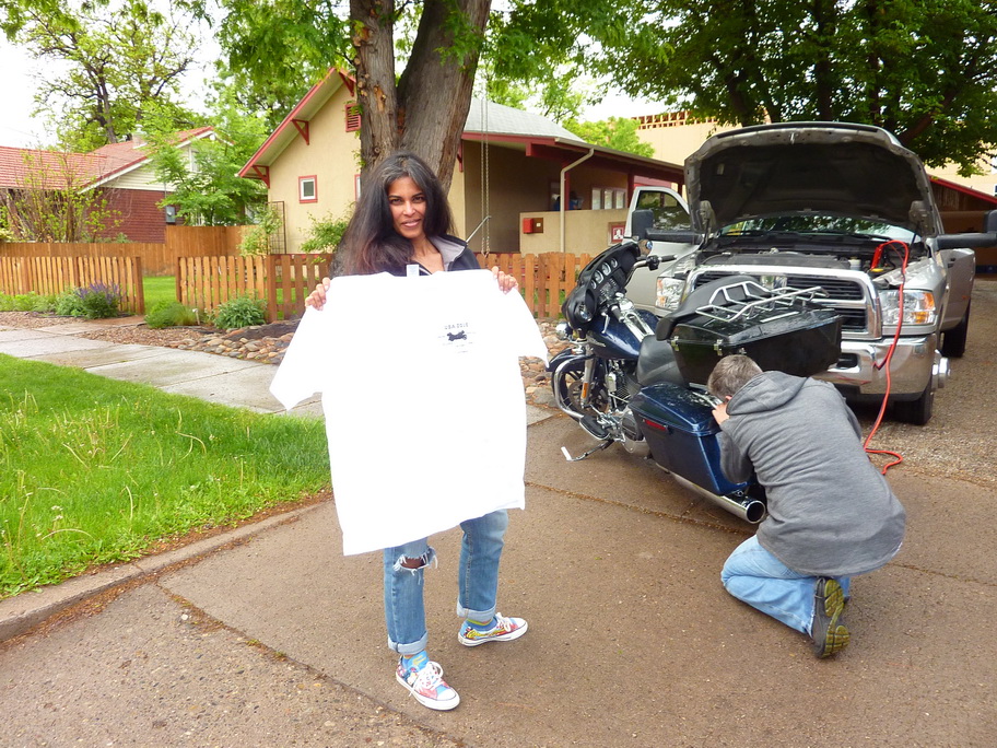 Voilà tout est prêt, nous remercions glenn pour le déplacement express. Nous faisons une photo souvenir et je laisse à natacha , sa copine , un Tshirt de notre trip avec le logo qui va bien : Elle est ravie.